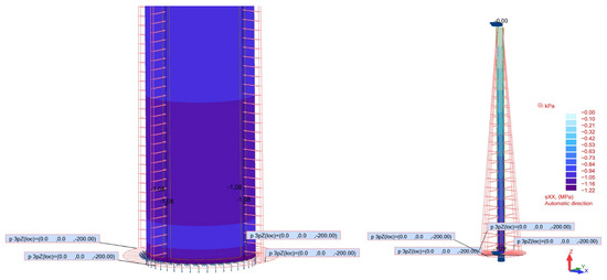For calculation of applied thrust pressure on the support by numerical modeling, Robot Structural Analysis [28,29] has been used. The software enables the simulation of various structures, such as buildings, bridges, and other structures, under diverse load conditions. It provides a broad spectrum of tools for structural analysis and design, including finite element analysis, code-based design, and dynamic analysis. The software also permits the modeling of different types of materials, such as concrete, steel, and timber. Robot Structural Analysis works by using a finite element analysis (FEA) method [30,31,32,33], which entails breaking down a complicated structure into smaller, more manageable components known as finite elements. These elements are governed by a set of mathematical equations that dictate their behavior, and when assembled, they form a comprehensive model of the structure. Subsequently, the modeled structure is subjected to various types of loads, including gravity, wind and other forces, to simulate its response. The software calculates the stresses, strains, and displacements across the structure and evaluates whether it satisfies the necessary safety standards and code regulations.