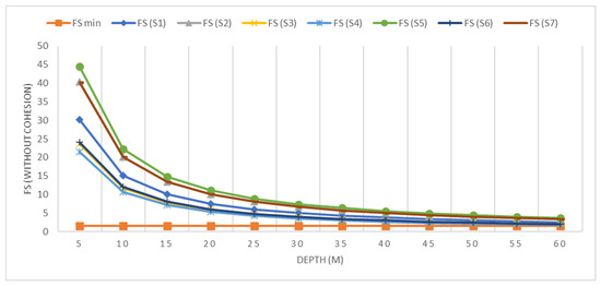 Figure 6 displays the variation of the safety factor in relation to the depth. This variation corresponds to an exponential decay curve, meaning that the safety factor decreases exponentially between the surface and a depth of 25 m. Beyond that, the variation of the safety factor, by varying the analyzed parameters, is also sensitive to the depth. However, the safety factor remains consistently above 1.5 across all scenarios studied, as indicated by this figure.