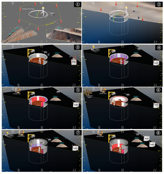 Conceptual model for sampling the screening pile by mining wells: ① Setting up safety marking for the concerned area and marking the well contour; ② Starting excavation of the first meter; ③ Recovering the 1st sample; ④ Placing the reinforcement grid; ⑤ Installing the metal formwork; ⑥ Pouring concrete; ⑦ Walling the well, recovering the 2nd sample, and placing the 2nd reinforcement grid; ⑧ Installing the formwork and pouring concrete, then recovering the 3rd sample and continuing the excavation of the well.