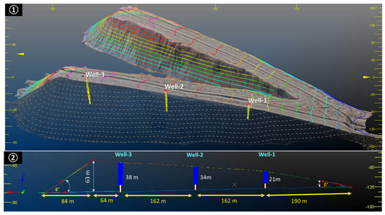 Detailed Three wells localization in the PMWR: ① Perspective representation (3D view) of the left arm of the screening PMWRS; showing the location of the three wells (Well-1, Well-2, and Well-3) that are executed for deep samples collection, the spacing between the wells is approximately 162 m. ② Projection of the three wells on a longitudinal section representing the status of the depth excavation in each well; respectively well-1 is 21 m; well-2 has 34 m and well-3 has 38 m completed.