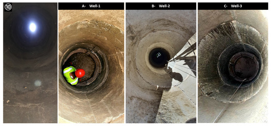 Result of excavation and final status of the three mining wells (well-1, well-2, and well-3) with different views from the bottom and from surface of the wells: ⑩ Reinforced concrete support of the wells is stable, and no signs of failure or cracking have been reported.