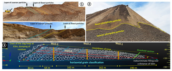 Illustration of the stockpile construction process and its evolution. ①—Artificial stratification resulting from a grain-size classification with fine particles at the top and coarse particles at the base of the screening PMWRS in ②. ③—longitudinal section showing the stockpile process construction and its evolution.