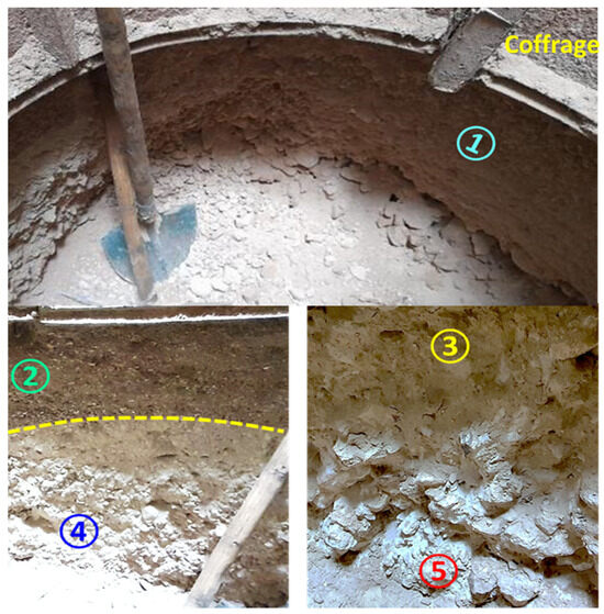 The findings highlighted during the analysis of the construction processes of the screening stockpile mentioned above are well recorded on the walls of the wells (Figure 13). During the excavation of the wells, a daily follow-up was carried out, focusing on the lithological survey of the shaft walls and the stripping of the excavated materials. It should be noted that in the sampling wells, it was noticed that the particle size classification is spectacularly expressed. As the excavation works progress deeper, the grain size increases due to the litho-stratigraphic weight and fluid circulation. It is important to note that the indured phosphate lithology have become slightly friable and can be partially attributed to the production of phosphate fines.