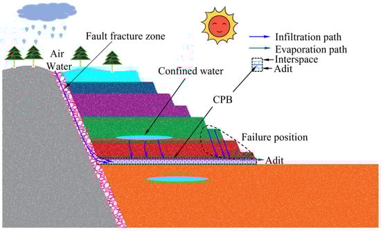 After high-intensity mining, open-pit coal mines leave a considerable amount of coal resources within the mining boundary. Due to the previous lack of coal mining theory and poor mining technologies, coal resources have been wasted [18]. At this time, waste is backfilled to the stope and adit, which not only improves the recovery rate of coal resources but also realizes the comprehensive utilization of solid waste mine resources as CPB [19]. However, in the process of coal mining, in the complex geological environment, rainfall easily infiltrates into the interior of the mining chamber along fault fracture zones and slope steps [20]. At the same time, groundwater easily infiltrates the adit along fractures after coal mining [21]. The exposure of CPB to air and water cause it to repeatedly undergo wetting–drying cycles [22], so the CPB is degraded by the water–rock chemical reaction [23], as shown in Figure 1. Therefore, it is necessary to study the solid waste utilization method of open-pit coal mines and CPB performance under wetting–drying cycles.