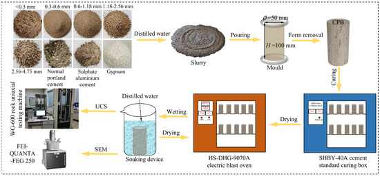 In this study, normal Portland cement, sulfoaluminate cement and gypsum were selected as cementing materials for the marl particles. Their basic physical properties and main component contents are shown in Table A3, Table A4, Table A5 and Table A6. Since CPB has difficulty in meeting the requirements of early strength with Portland cement alone, other reagents are often added [46]. Therefore, four different composite cementing materials were set up, and the mass ratios of normal Portland cement:sulfoaluminate cement:gypsum were 10:0:0, 8:0:2, 8:1:1, and 8:2:0. At room temperature, standard samples (50 mm in diameter and 100 mm in height) were prepared by cementing material and marl aggregate with a cement–sand ratio of 1:4.23 and a slurry concentration of 76%. A sample was placed at a temperature of 20 ± 5 °C for 24 h until solidified; then, it was numbered, demolded and placed in a SHBY-40A cement standard curing box with a temperature of 22 °C and a humidity of 95% for 28 days. The sample preparation process is shown in Figure 3.