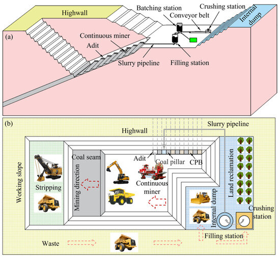 Highwall mining originated in the United States and subsequently became an important means of mining open-pit coal in the United States, Australia, Indonesia and other countries [47,48,49]. Due to the large number of coal pillars set up in the highwall mining process [50,51], the recovery rate of highwall coal resources has not been considerably improved. Currently, nonpillar mining technology by using waste as the filling aggregate has great advantages. In this study, the highwall filling mining method (Figure 4a) is proposed for the first time. It is based on the technology of mining the overlying coal seam under the highwall of the continuous shearer [52]. The filling process system is integrated, and the waste is used as the aggregate to form CPB, which completes the filling of the adit formed by the continuous shearer mining, thereby controlling the movement of the slope rock layer. The main process is as follows: the continuous shearer mining forms a series of adits in the overlying coal seam under the highwall by means of sequential skip mining, and then the wastes (coal gangue, soil–rock mixture, etc.) produced by the stripping of the working side are transported to the crushing station through the mining truck, and the wastes are broken into aggregate particles of appropriate particle size and then transported to the batching station through the belt conveyor to mix with cement materials and water to form CPB slurry. The filling pump station transports the CPB slurry to the adit through the pipeline for filling and then recovers and fills the coal pillar after the filling of the adit is completed. The specific implementation method is described in a patent [53]. Finally, the stripping–mining–transportation–filling/dumping–reclamation integrated collaborative operation is realized, as shown in Figure 4b. Through technological and conceptual innovation, green mining with zero ecological damage is achieved, which improves the recovery rate of coal resources, realizes solid waste utilization and greatly reduces the damage to the ecological environment. This mining technology was first applied to the Puyang open-pit coal mine in China.