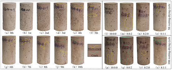 The CPB samples with a composite cementing material ratio of 8:1:1 were subjected to 10 wetting–drying cycles. For the zero–two wetting–drying cycle CPB samples, the surface of the samples remained intact, and no visible microcracks were found, as shown in Figure 5a–c. In the process of three~four wetting–drying cycles, a few pinnate microcracks formed on the upper surface of the samples, and the range of microcracks was small, as shown in Figure 5d,e. Starting from the fifth cycle, pinnate microcracks and other microcracks appeared in the upper and middle parts of the sample surface, as shown in Figure 5f. During the sixth cycle, V-type microcracks appeared on the upper part of the sample, the crack length increased and the microcracks gradually expanded, as shown in Figure 5g. During the seventh and eighth cycles, crack microcracks and V-type microcracks were generated in the upper and middle parts of the samples, and the range of microcracks gradually expanded, as shown in Figure 5h,i. During the 9th and 10th cycles, microcracks and cracks appeared on the surface of the samples, the microcracks gradually expanded into Y-type cracks and axial cracks and the crack length and range increased, as shown in Figure 5j,k. According to the change in cracks, the crack propagation of CPB samples in the wetting–drying cycles can be divided into several stages: fine crack formation stage—V-type, pinnate microcrack development stage—crack microcrack formation stage—Y-type crack propagation stage.