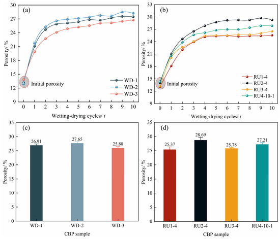 Changes in porosity of (a) samples WD-1, 2, 3 and (b) samples RU1, 2,3-4 and RU4-10-1 with with wetting-drying cycles; average values of porosity of (c) samples WD-1, 2, 3 and (d) samples RU1, 2,3-4 and RU4-10-1 after the fourth wetting-drying cycle.
