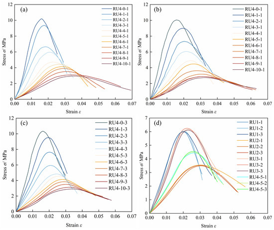 Stress-strain curves of (a) RU4-0~10-1, (b) RU4-0~10-2, (c) RU4-0~10-3, (d) RU1-1~3, RU2-1~3, RU3-1~3, RU4-5-1~3 under different wetting-drying cycles.