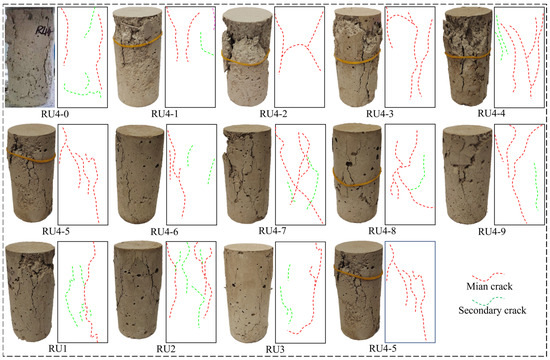In 1960, Griggs performed a statistical analysis to classify rock uniaxial compression failure. According to the strain corresponding to the peak stress in the stress–strain curve, rock deformation can be divided into brittle failure, brittle–ductile transition failure and ductile failure [58]. Figure 7 shows that the strain value of the CPB sample to reach the peak stress is between 1.5% and 3.5%. If there is a relatively complete stress–strain curve, the CPB sample is judged to be in ductile failure. This is consistent with the results of Zhao et al. [61]. Bobet and Einstein [62] carried out uniaxial compression tests on prefractured gypsum samples and proposed a mechanism of crack coalescence under uniaxial compression: the mechanism of shear coalescence is usually characterized by a crack propagation path with twists and turns, rough crack edges, and more broken particles in the sample; the tensile penetration shows that there are no broken solid particles on the crack surface, and the crack edge is relatively smooth. Shear and tensile coalescence conforms to failure between the two. Combined with Figure 8, it was found that there are fewer main cracks in samples RU4-0, RU4-1, RU1 and RU3, and that there are fewer secondary cracks around the main cracks. The edge of a crack is relatively regular, but there is local falling debris. Therefore, it was determined that the penetration form of these CPB cracks is shear and tensile penetration. The main cracks of RU2 and RU4-2~RU4-9 are more numerous, and the crack propagation path, with more secondary cracks, is more tortuous and prone to form debris and cause debris falls, which indicates that the crack coalescence form of these samples is shear coalescence. This shows that the crack propagation of CPB is not only affected by the particle size distribution and mechanical damage but also related to the properties of the cementing materials and wetting–drying cycle damage.