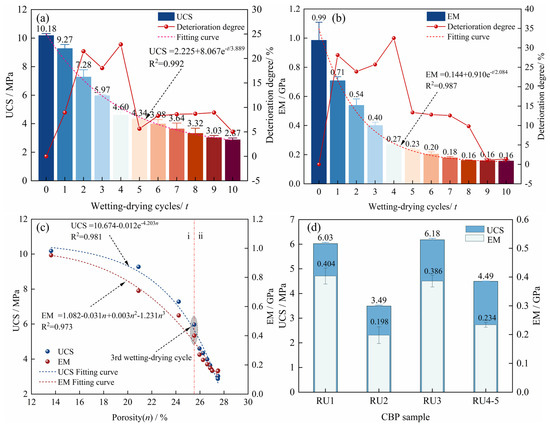 where and are the deterioration degrees of UCS and EM, respectively; and are the UCS (MPa) and EM (GPa) of wetting–drying cycle t; and and are the UCS (MPa) and EM (GPa) of wetting–drying cycle t + 1.