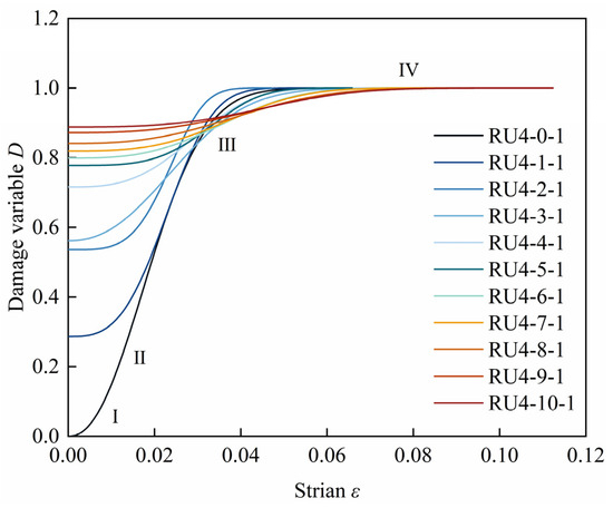 The parameters in Table 2 were brought into Equation (15) to obtain the damage variable evolution curves of CPB samples under different wetting–drying cycles, as shown in Figure 10. There were significant differences in DW for different wetting–drying cycles. As the number of wetting–drying cycles increased, DW increased. In general, compared with CPB samples without wetting–drying cycles, the influence of the first three wetting–drying cycles were the largest for DW, and the values were between 0 and 0.562. The DW variation during four–ten wetting–drying cycles was relatively small, and its value was between 0.716 and 0.888. The damage accumulation of the CPB sample gradually slowed, namely, the axial strain gradually increased. The damage variable of the CPB sample reached one in a large strain range. The evolution curve of the total damage variable showed an S shape and was divided into four stages (taking CPB samples without wetting–drying cycles as an example). The initial damage stage I: there were microcracks in the CPB at this stage, and the microcracks gradually closed under uniaxial loading. In a small strain range, the CPB remains. Accelerated damage propagation stage II: in this stage, with the increase in the load, the microcracks inside the CPB developed rapidly, resulting in the dislocation and connection of pores and cavities; the total damage value increased rapidly, and the CPB peak strength was reached. Damage decelerated propagation stage III: the microcracks and voids inside the CPB were connected, so that the CPB gradually lost its bearing capacity, and the total damage value gradually approached one. End of damage stage IV: the CPB internal cracks broke through to the surface, and the CPB completely lost its bearing capacity, so the total damage value remained unchanged at one.