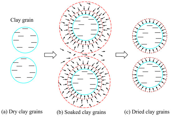 Most of the striped rock layers in open-pit coal mines belong to geological soft rock, often containing a large amount of expansive clay minerals, which easily soften, expand and disintegrate in water [24]. Currently, with CPB with waste as the aggregate, clay minerals and their influence on its performance need to be considered [25]. Previous studies on backfill materials containing clay minerals under wetting–drying cycles mainly focused on the effect of gypsum on backfill. Aldaood et al. [26] showed that, under wetting–drying cycles, the higher the gypsum content, the greater the crack propagation and the smaller the unconfined compressive strength (UCS) of the soil sample. Durgun [27] found that polypropylene reduces the negative effects of wetting–drying cycles on gypsum-containing basalt pumice, reducing the loss of flexural strength to less than 7%. Li et al. [28] believed that extending the curing period of gypsum-treated soil samples from 7 days to 21 days could reduce the formation of vertical cracks during soaking. Ying et al. [29] indicated that wetting–drying cycles softened gypsum-treated soil and that seawater was more likely to cause macropore development than deionized distilled water. Although these studies have increased the understanding of the effect of wetting–drying cycles on gypsum-treated soil, there has been no relevant experimental study on the effect of CPB containing clay minerals, and the degree and mechanism of deterioration need further study.