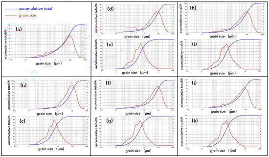 Particle size distribution of hydrocyclone products: (a) feed product, (b) overflow 1 product, (c) riffling 1 product, (d) overflow 2 product, (e) riffling 2 product, (f) overflow 3 product, (g) riffling 3 product, (h) overflow 4 product, (i) riffling 4 product, (j) overflow 5 product, and (k) riffling 5 product.