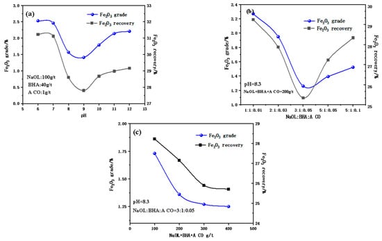 The recovery rate and grade of Fe2O3 varied depending on (a) the pulp pH, (b) the NaOL/BHA/A CO ratio, and (c) the amount of collector.