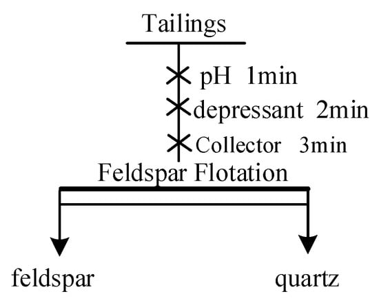 The aforementioned tailings were subjected to further flotation. The mixed collector was used to separate feldspar from quartz. Sodium silicate is used as a depressant of quartz. During this process, the collecting agents were added to the ore pulp in the sequence of DDA and SDS, as depicted in Figure 6. The effects of various factors, such as ore pulp pH, DDA/SDS mixing ratio, and collecting agent dosage, were examined, and the flotation process was assessed based on the grade and recovery rate of the quartz product.