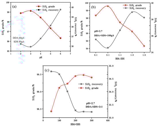 The recovery rate and grade of SiO2 varied depending on (a) the pulp pH, (b) the DDA/SDS ratio, and (c) the amount of collector.
