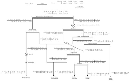 On the basis of the above research, further research on the test flow was carried out to obtain an efficient selection process scheme. Figure 8 illustrates the mass balance chart for the comprehensive utilization of weathered granite.