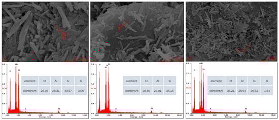 The nine routine chemical components are important criteria for testing the quality of non-metallic raw materials in China. They include the content of LOI (1025 °C), Al2O3, SiO2, Fe2O3, CaO, MgO, K2O, Na2O, and TiO2 [34]. The analysis results of the five products are shown in Table 8 and Table 9. Among them, the silica content of quartz products is more than 99%, and the whiteness is 95.5, which meets the standard of refined quartz sand. Feldspar products have an iron content of less than 0.5% and a whiteness of 35.9, which is suitable for the production of glazes and flat glass as high-quality feldspar products. Feldspar by-products with an iron content of less than 1% can be used as tertiary feldspar products for enamel production. The raw materials of aerated brick have a high content of silicon and iron, which meet the preparation standards of aerated brick. Kaolin has a high content of aluminum and silicon, and its whiteness is 61.9. In order to determine whether it meets the product standards of kaolin, a particle morphology analysis is required.