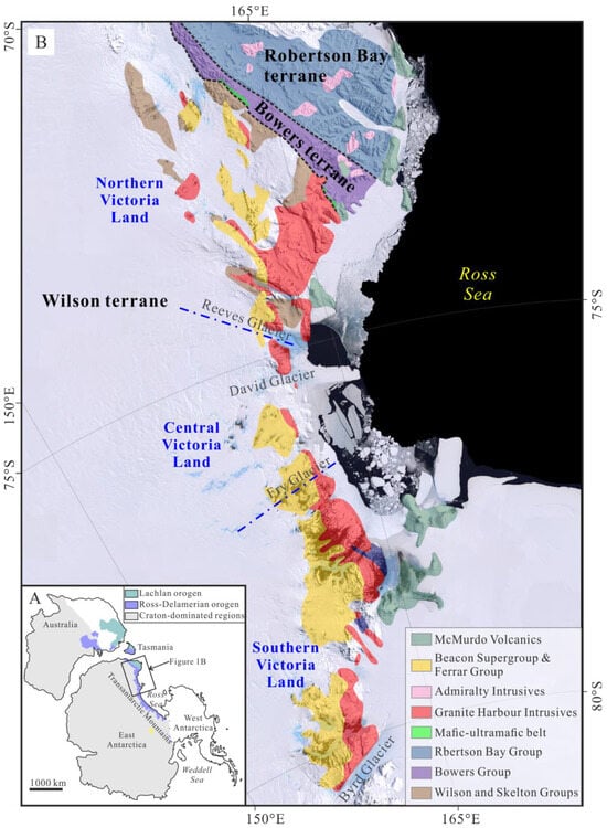 (A) Pre-Gondwana-breakup configuration of Antarctica and Australia, showing Paleozoic Ross–Delamerian orogen [11]. (B) Sketch geological map of Victoria Land (Antarctica), showing the distribution of the Granite Harbour Intrusives (modified from [12]). Satellite image of the Victoria Land is obtained from the Landsat Image Mosaic of Antarctica (LIMA) Project accessed on 11 July 2023 (http://lima.usgs.gov).