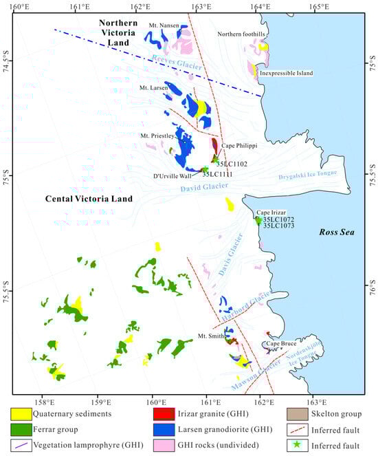 Sketch map of the Central Victoria Land, showing the distribution of Larsen granodiorite and Irizar granite (modified from [57]). Abbreviations: GHI, Granite Harbour Intrusives; Mt., Mount.