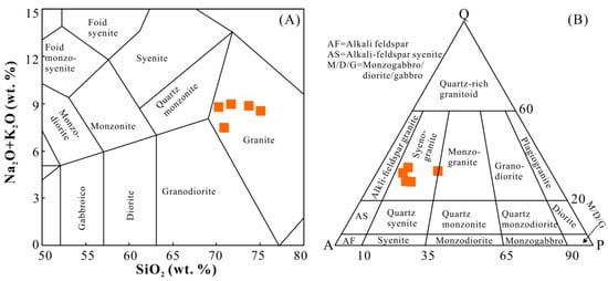 (A) SiO2–Na2O + K2O [61], (B) Q–A–P modal classification [62]. Elemental composition for the Irizar granite is collected from [11]. Compositions of the Irizar syenogranite are shown as orange squares.