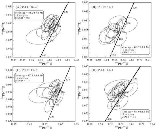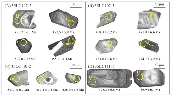 Eighteen zircon spots were analyzed for sample 35LC107-2. Most analyses are slightly discordant, with 207Pb/206Pb apparent ages ranging from ~527 Ma to 355 Ma (Table S1). Among them, the 15 least discordant spots fall on or near the concordia curve and have 206Pb/238U apparent ages varying from ~485 Ma to 506 Ma (Table S1), yielding a weighted mean age of 498.3 ± 3.2 Ma (MSWD = 0.8; Figure 6A). In addition, one data point from zircon with a CL-dark band has high U concentration of 1275 ppm and yields an older 206Pb/238U apparent age of ~527 Ma (Figure 5C—35LC107-2@13; Table S1). This is probably related to the high-U matrix effect in zircon [70]. Another two data points from structure-damaged zircon have much younger 206Pb/238U apparent ages of ~462–355 Ma (Figure 5C—35LC107-2@18; Table S1), probably due to the metamictization of zircons. The three abnormal data points are, thus, not used in the age calculations.