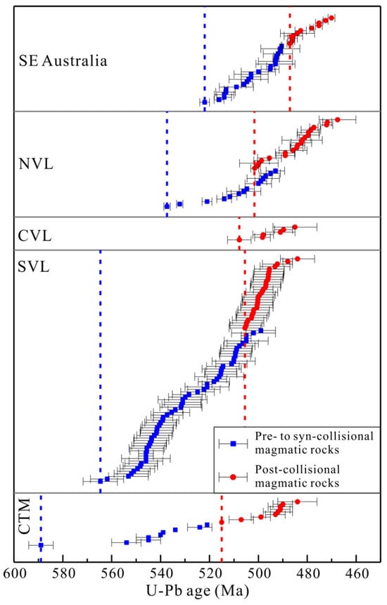 To improve our understanding of the tectonic evolution of the Ross–Delamerian orogen, we compiled and synthesized as much U-Pb geochronological data as available from the literature [9,11,13,16,18,19,20,22,27,28,32,41,52,53,54,60,76,79,88,89,90,91,92,93,94,95,96,97,98] (Table S2), which are graphically shown in Figure 7. The geochronological data for the pre- to syn-tectonic calc-alkaline granitoids are systemically younger northward from ~590–520 Ma in the Central Transantarctic Mountains, through ~565–505 Ma in the Southern Victoria Land, and ~535–500 Ma in the Northern Victoria Land to ~520–490 Ma in the Southeast Australia (Figure 7). This is broadly consistent with the conclusions by Foden et al. [9] (2006) and Rocchi et al. [11,23] that the subduction propagated northward from ~540 Ma at the Ross orogen to ~514 Ma at its Southeast Australia counterpart. However, a much earlier initiation of the subduction-related magmatism in the Central Transantarctic Mountains than previously recognized is implied by the recent zircon U-Pb ages of ~590 Ma for the foliated muscovite-biotite granite clasts [18]. This is also in good agreement with previous speculation based on compositions and U-Pb ages for detrital zircons from the major Neoproterozoic and lower Paleozoic siliciclastic rocks in the Central Transantarctic Mountains [38].