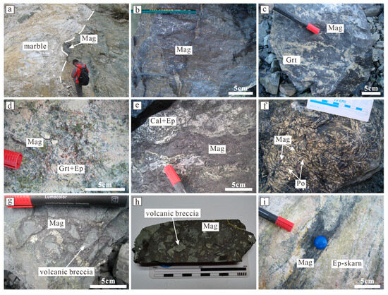Photographs of the different ore types in the Beizhan iron deposit. (a) Massive magnetite (Mag) ores at the contact between altered host rock and marble. (b) Massive magnetite ore. (c) Massive magnetite ore with fracture infill of garnet (Grt) skarn. (d) Disseminated magnetite in garnet–epidote (Ep) skarn. (e) Disseminated magnetite in calcite (Cal)–epidote veins in proximity to massive ores. (f) Platy magnetite in association with platy pyrrhotite (Po). (g) Contact between host volcanic rock and magnetite ore, where volcanic breccias are cemented by magnetite. (h) Volcanic breccias in the magnetite matrix. (i) Veins of magnetite in the epidote skarn.