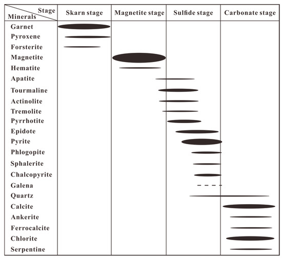 The paragenetic sequence of the Beizhan iron deposit was subdivided into four stages based on field and petrographic observations (Figure 5). The skarn stage (I) is characterized by the development of skarn minerals, including garnet, diopside, and forsterite. The magnetite stage (II) represents the primary stage of magnetite mineralization, accompanied by minor precipitation of hematite, apatite, actinolite, and tremolite. The sulfide stage (III) is marked by veins of sulfide minerals such as pyrrhotite, pyrite, sphalerite, and chalcopyrite, often closely associated with magnetite ore. The chlorite-carbonate stage (IV) is represented by the formation of carbonate, chlorite, and serpentine, along with small quantities of magnetite and hematite.