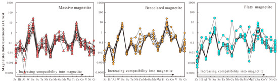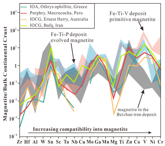 Bulk continental crust-normalized multielement plots of magnetite from the Beizhan iron deposit. Bulk continental crust values are from [54]; the order of elements is in accordance with the increasing compatibility with magnetite [55].