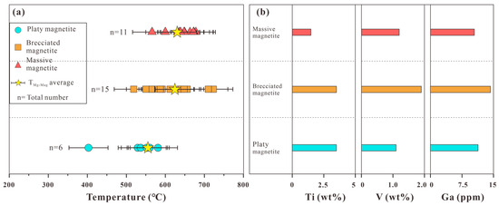 The precipitation temperatures of various magnetite types from the Beizhan deposit are illustrated in Figure 7a. Additionally, the average concentrations of Ti, V, and Ga in these magnetite types are plotted in Figure 7b. The calculated temperatures for magnetite precipitation in the Beizhan deposit span a range from approximately 403 °C to 723 °C. Specifically, the massive and brecciated magnetite yield a similar temperature range, spanning approximately 566 to 678 °C (with an average of 612 °C) and 519 to 723 °C (with an average of 641 °C), respectively, both higher than those of platy magnetite, ranging from approximately 403 to 581 °C, with an average of 552 °C (except for an erratic value of 403 °C).