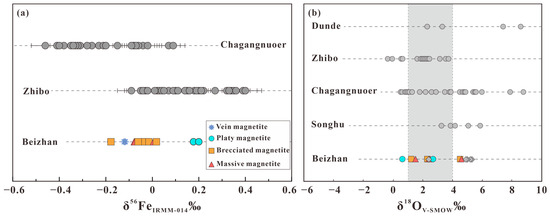 Comparison of (a) Fe isotopic and (b) O isotopic compositions for magnetite from the Beizhan deposit with other iron deposits in the AIMB. Also included are δ56Fe values [56] and δ18O values (gray diamonds) [17] for magnetite from the Beizhan deposit. The δ56Fe ranges for the Zhibo and Chagangnuoer iron deposits are from [12,56]. The δ18O ranges for the Dunde, Zhibo, Chagangnuoer, and Songhu iron deposits are from [17,33,35,36,57,58,59].