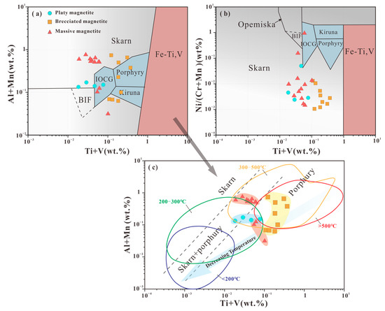 Discrimination diagram of (a,c) Al + Mn vs. Ti + V and (b) Ni/(Cr + Mn) vs. Ti + V for magnetite from the Beizhan iron deposit (after [60] and modified by [62]). The different fields of temperature are adapted from [63,64].