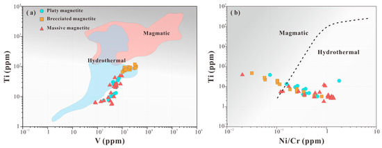 Discrimination diagram of (a) Ti vs. V and (b) Ni/Cr vs. Ti for magnetite from the Beizhan iron deposit. Fields of magmatic and hydrothermal magnetite are from [62,65,66].
