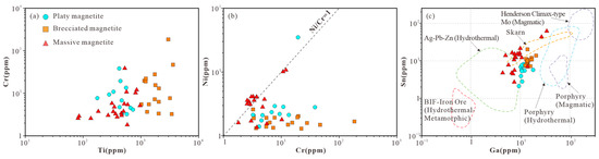 Binary diagrams of (a) Cr vs. Ti, (b) Ni vs. Cr, (c) Sn vs. Ga for magnetite from the Beizhan iron deposit, the different types magnetite from the typical porphyry (magmatic), porphyry (hydrothermal), skarn, Ag-Pb-Zn (hydrothermal), and BIF-iron ore (hydrothermal–metamorphic) [64,67].