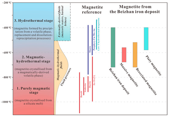 Thermal evolution of the Beizhan iron deposit. Reference temperatures of magnetite from various volcanic rocks and deposits, and magmatic to hydrothermal stages are from [70] and [69].