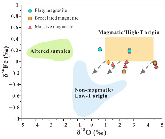 δ56Fe vs. δ18O diagram for magnetite from the Beizhan iron deposit (modified from [6]). The orange box denote the isotope ranges of magmatic or high-T origin [68,70,77,83,84].