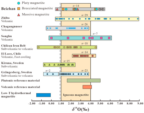 Considerable research has focused on the variability in δ18O values of magnetite from different ore types of iron deposits, indicating the potential for using δ18O values to distinguish deposit types and infer their genesis [17,56,59,85,86]. Magnetite formed through magmatism typically exhibits a relatively narrow range of δ18O values, usually falling between +1‰ and +4‰ [5,59,70,83,87]. Oxygen isotope analyses of magnetite samples extracted from different types of iron ore in the Beizhan iron deposit (massive, brecciated, and platy type) predominantly yield δ18O values ranging from +0.6 to +4.6‰, which are highly consistent with those of magnetites found in the iron oxide deposits in the AIMB (Zhibo, Chagangnuoer, and Songhu iron deposits) [35,36]. Furthermore, these δ18O values closely resemble those observed in the El Laco and Kiruna deposits (Figure 15) [5,7,8,10,70,87].