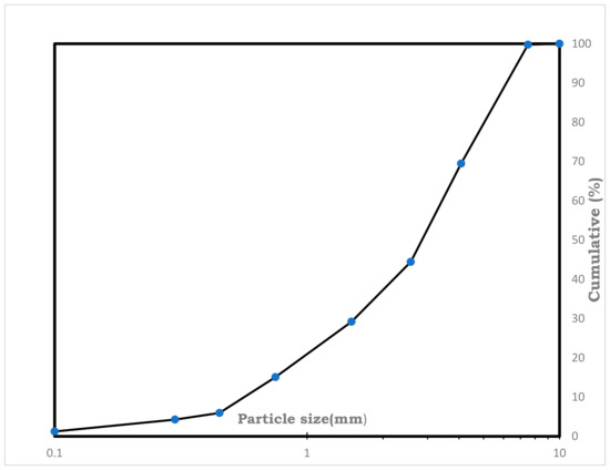 For the float–sink tests, 15 kg of celestine ore with a medium grade (83.33% celestine) and a particle size ranging from 0.1 to 10 mm were used (see Table 1 and Table 2 and Figure 1). A sample of 10 tons of medium-grade celestine ore (77.23% celestine) from Montevive’s tailings was recovered for validation tests in the hydrocyclone (Table 1 and Table 2, Figures S1 and S2). The chemical and mineralogical composition of the mineral was determined by X-ray diffraction (XRD) using a Xpert Pro X-ray powder diffractometer (Panalytical, Almelo, The Netherlands). The samples were measured in reflection mode using copper radiation (from 4 to 120° with 0.017° step size and 100 s integration time per step). Identification of the main mineral phases present in the samples was carried out using XpowderX software (version 2021.04.21). For quantitative mineral analyses, XRD patterns were analysed using the Rietveld refinement method with Topas v 5.0 software (Bruker, Billerica, MA, USA). The main XRD results are summarised in Table 1 and show that celestine (83.33% in the float–sink sample; 77.23% in the validation sample) and calcite (9.79% in the float–sink sample; 12.89% in the validation sample) were the main mineral phases detected in the float–sink tests. Other minority mineral phases (<10%) were strontianite, quartz, dolomite, and illite. Additionally, the chemical composition of samples was analysed by X-ray fluorescence (XRF) using an S2 Ranger Bruker energy-dispersive spectrometer (Bruker-AXS, Karlsruhe, Germany) equipped with an X-ray tube with Pd anode and an EDX detector with <155 eV resolution. The system was calibrated using a Cu disk and checked with a glass BAXS-S2. The main results obtained by XRF are summarised in Table 2.