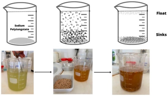 To determine the optimum density of the dense medium for the separation experiments, a set of float–sink tests was carried out using the DMS hydrocyclone. Sodium polytungstate (SPT-1; SG: 3.10; Sometu Europa, CAS-No:12141-67-1) was diluted at different concentrations in water to prepare the dense medium with different densities (2.7, 2.8, 2.9 kg/L). Then, the ore mineral was classified into fractions with different particle sizes using a vibrating screen (>5 mm; −5 mm + 3.15 mm; −3.15 mm + 2 mm; −2 mm + 1 mm; <1 mm). Next, the mineral fraction with a given particle size (100 g) was mixed in the dense medium and then left to sit (Figure 2). Then, the mineral separated into the float and sunk fractions were recovered, washed with Milli-Q water, and dried in an oven at 120 °C for 24 h.