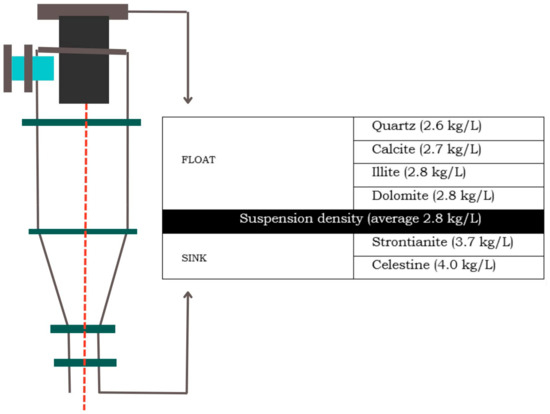 Previous studies have demonstrated that gravity separation techniques are very suitable for the beneficiation of low-grade celestine mineral (about 70% celestine), which is currently uneconomical and accumulated in dumps and mine tailings. This mineral can be concentrated based on mineral separation and classification after grinding and celestine concentration by dense medium separation methods (DMSs) [3,11]. The proposed method for celestine ore concentration is based on the difference in density between the mineral phase of interest (celestine) and the rest of the uneconomical mineral phases (gravimetric concentration). Density-based separation technologies have historically been used to process a variety of materials [12]. In particular, dense media cyclones (DMCs) have been widely used in mineral processing due to their advantages, including large processing capacity, high separation efficiency, and easy automatic control [13].