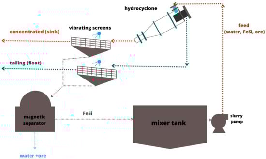 The concentration plant consists of the following parts shown in the layout of Figure 4: a mixing tank (1100 L), a slurry pump, a hydrocyclone, two vibrating screens with sprays, and a magnetic separator.