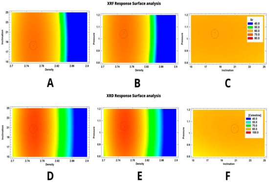 As main results, the model allows for the identification of optimising values of density, inclination, and pressure to maximise the concentration of Sr (identified by XRF) and Celestine (identified by XRD), as reported in Table 8.