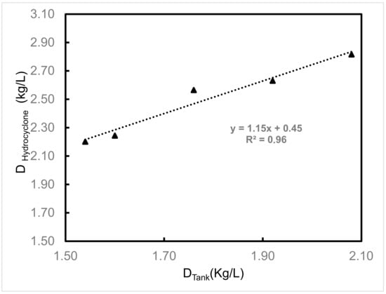 With the data obtained from the densities obtained in each vortex and apex test, the average density inside the hydrocyclone system (Dhydrocyclone) was calculated from the density of the tank (Dtank) using a linear regression model (Dhydrocyclone = 1.15 Dtank + 0.45, R2 = 0.96; Figure 7).
