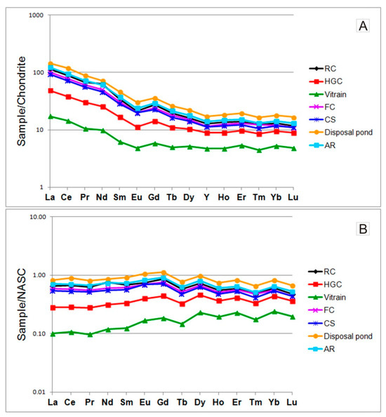 Normalized REE patterns of the Pernik coals and waste products to (A) chondrite [33] and (B) shales [73].