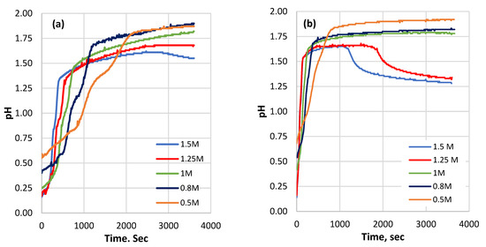 The pH variation during the processing time of the reaction: (a) coarse sample; (b) fine sample at different initial acid concentrations.