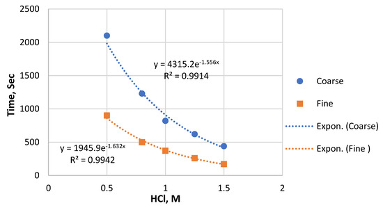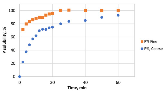 The leaching efficiency of P from the two particle size fractions of PR as a function of time was determined. The results are shown in Figure 3. The leaching efficiency of P from both samples increased with the prolonging of the process time. As assumed, the P solubility against time indicated that the coarse sample had a slow leaching rate from the beginning, while the fine samples showed a rapid reaction. The fine particles reacted faster, reaching slightly higher P recovery compared to the coarse sample under the same reaction conditions. It is clear that the particle size directly affects the dissolution rate.