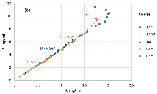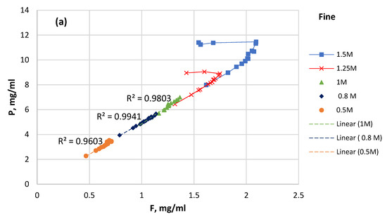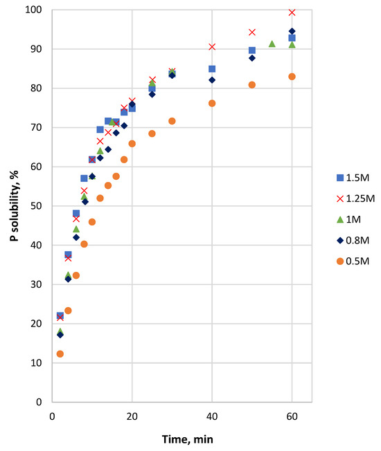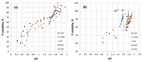 The plot of the P solubility of the coarse sample versus pH (Figure 7a) reveals that it can be divided into three different stages of different linearity. The P solubility reached almost 40% or above for all the coarse samples by a pH of 0.8. In the pH interval from 0.8 to 1.4, the solubility of P increased by only 10%–15%. At this point, all the samples reached a P solubility of 60% or above. Moreover, in the pH interval from 0.8 to 1.4, the P solubility was higher at a HCl concentration of less than 1 M and lower at a HCl concentration above 1 M. The next increase in P solubility by an additional ~30% raised the pH value up to 1.8.