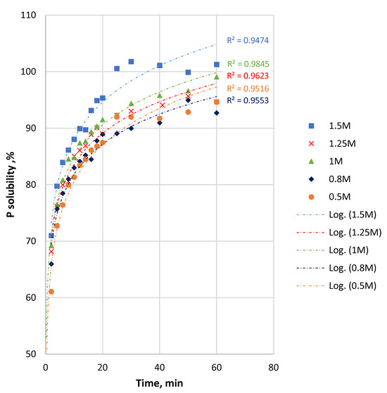 The dissolution of the fine sample was fast in the first 2 min, reaching up to 61%–71% depending on the acid concentration (Figure 5). The final P solubility for the fine samples was between 94 and 100% at 60 min. The logarithmic scale of the P solubility of the fine fraction versus time (Figure 5) shows that the difference in P dissolution between 0.5 M and 1 M acid was at the level of 3%–4% throughout most of the process. Comparing the 0.5 M and 1.5 M acid solutions, the level was about 7% until 15 min, increasing gradually to about 8% for the rest of the reaction duration.